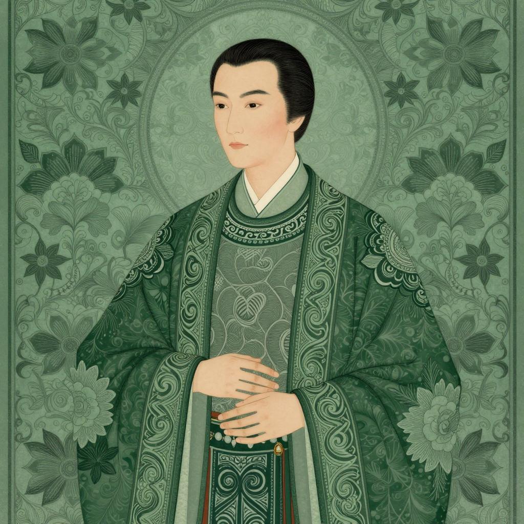 Detailed digital artwork of an elegant man wearing an intricately designed green robe. The character has a composed expression and is set against a decorative floral background in matching green hues, creating a harmonious and sophisticated aesthetic. The robe and backdrop feature ornate patterns with fine line work emphasizing the mystical atmosphere.