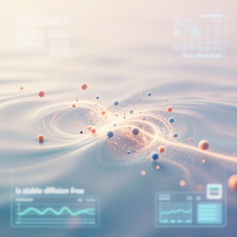 Visualize the concept 'is stable diffusion free' as an abstract scientific illustration featuring particles dispersing evenly in a fluid medium with glowing trails, a digital interface overlay showing fluid dynamics, and a soft, ethereal color palette.