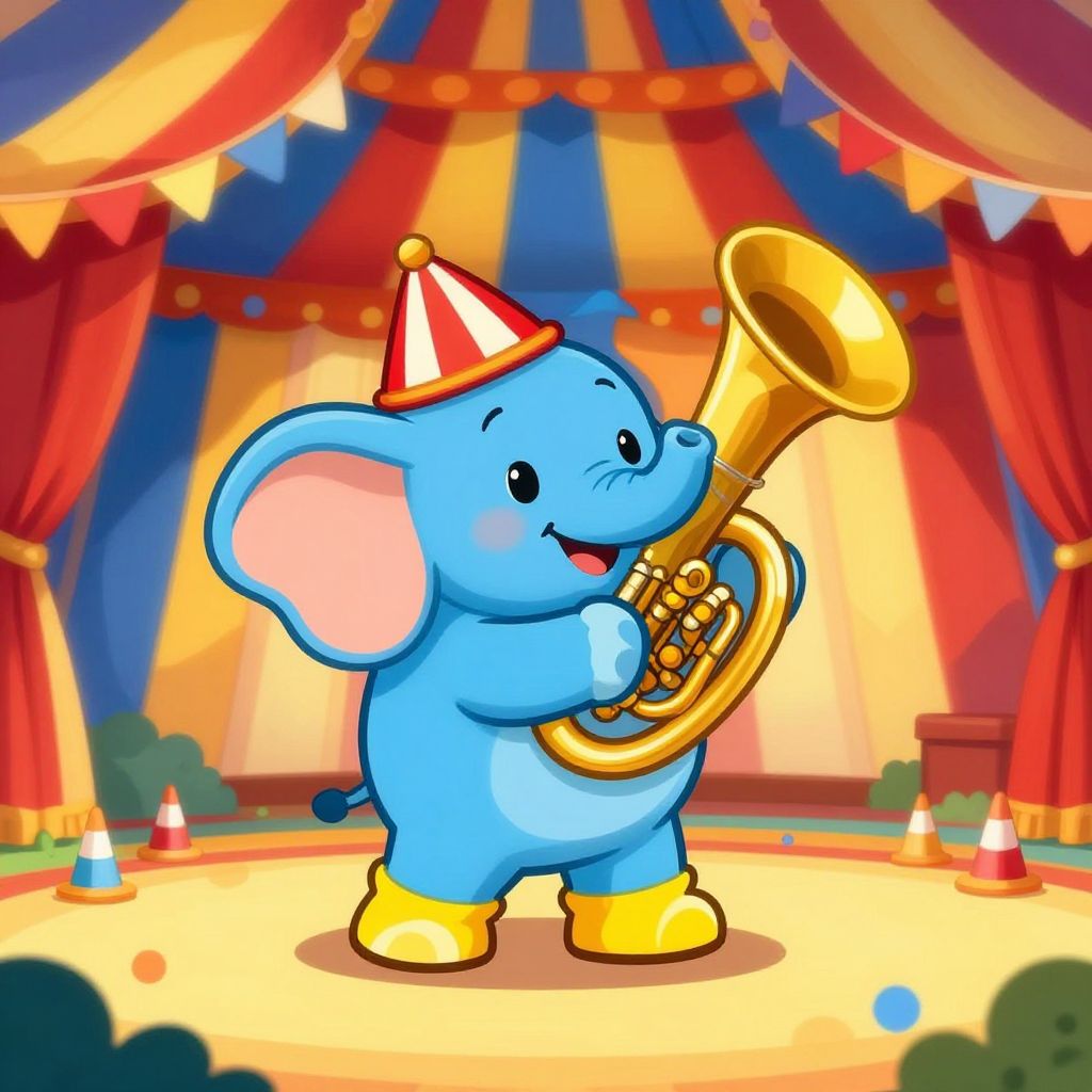 Colorful cartoon illustration of a blue elephant wearing a striped circus hat and big yellow shoes, playing a golden tuba inside a vibrant circus tent with red, blue, and yellow drapes. The scene features circus elements such as flags, small cone-shaped markers on the floor, and a festive atmosphere.