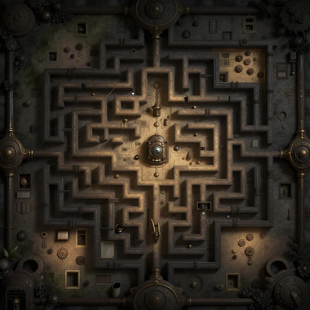 AI map maker DnD producing a detailed dungeon layout map, labyrinthine corridors, trap rooms, treasure vaults, and hidden passageways, dark mysterious color palette, high contrast shadows and highlights, seamless mix of digital art and traditional fantasy map aesthetics.