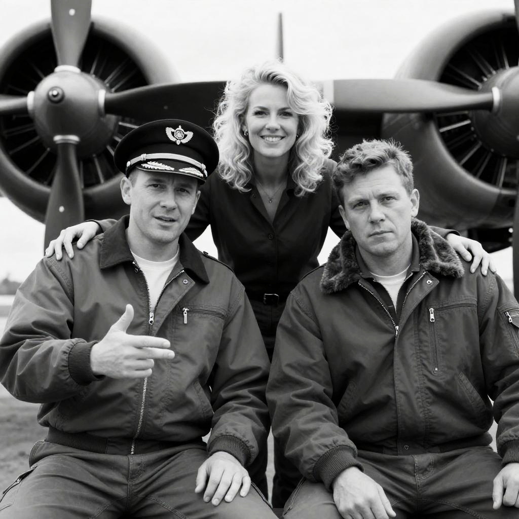 Black and white photograph of three people in front of a military plane. A smiling blonde woman with curled hair stands behind two men. The man on the left wears a pilot's cap and jacket, gesturing forward. The man on the right sits with a fur-lined jacket, looking serious. Plane's propeller and engine visible. All three have their arms resting on the plane.