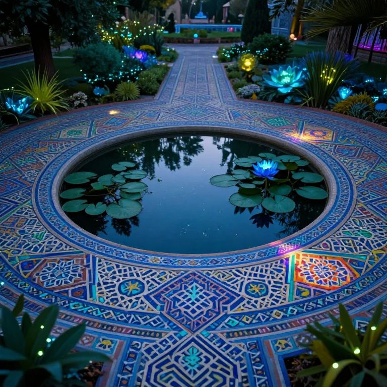 Envision an awe-inspiring digital art composition that intertwines the intricate patterns and vivid hues of Islamic geometric designs with a serene garden setting. From a high vantage point, this piece captures a mesmerizing mosaic of interconnected tessellations that gracefully dance across the landscape. A tranquil water lily pond serves as the focal point, its still waters reflecting the kaleidoscope of shapes above in a mirror-like surface. Ethereal bioluminescent flora, reminiscent of fireflies, softly illuminate the scene in an enchanting display of natural magic, casting a captivating interplay of light and shadow across the composition. This harmonious blend of ancient craftsmanship, nature's beauty, and fantastical elements evokes a profound sense of wonderment and peace within the viewer.