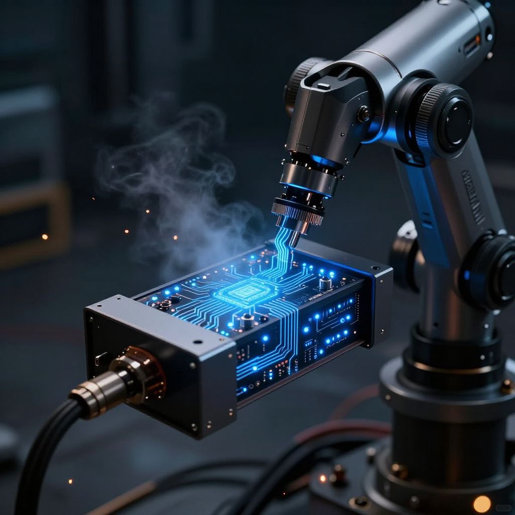 Photograph of a futuristic robotic arm soldering a glowing blue circuit board with visible steam, in a dark, industrial setting.