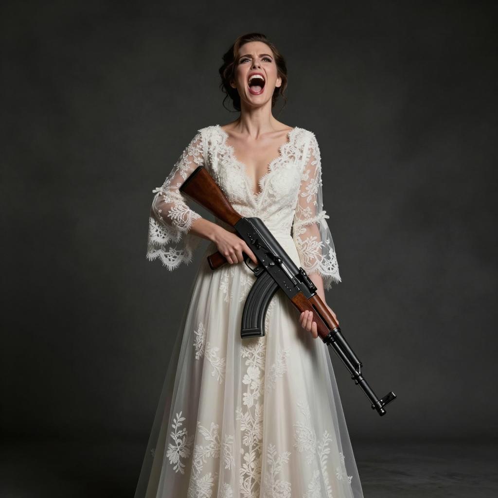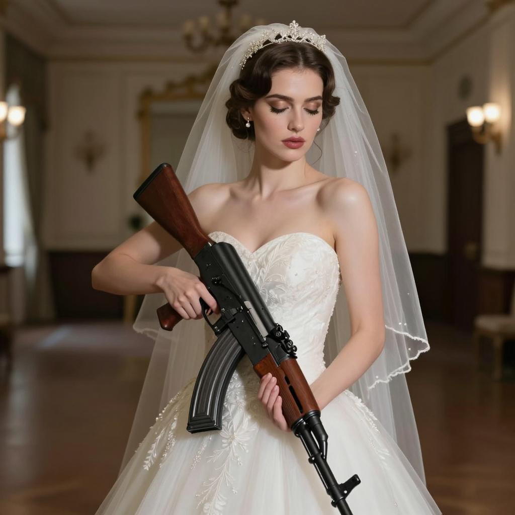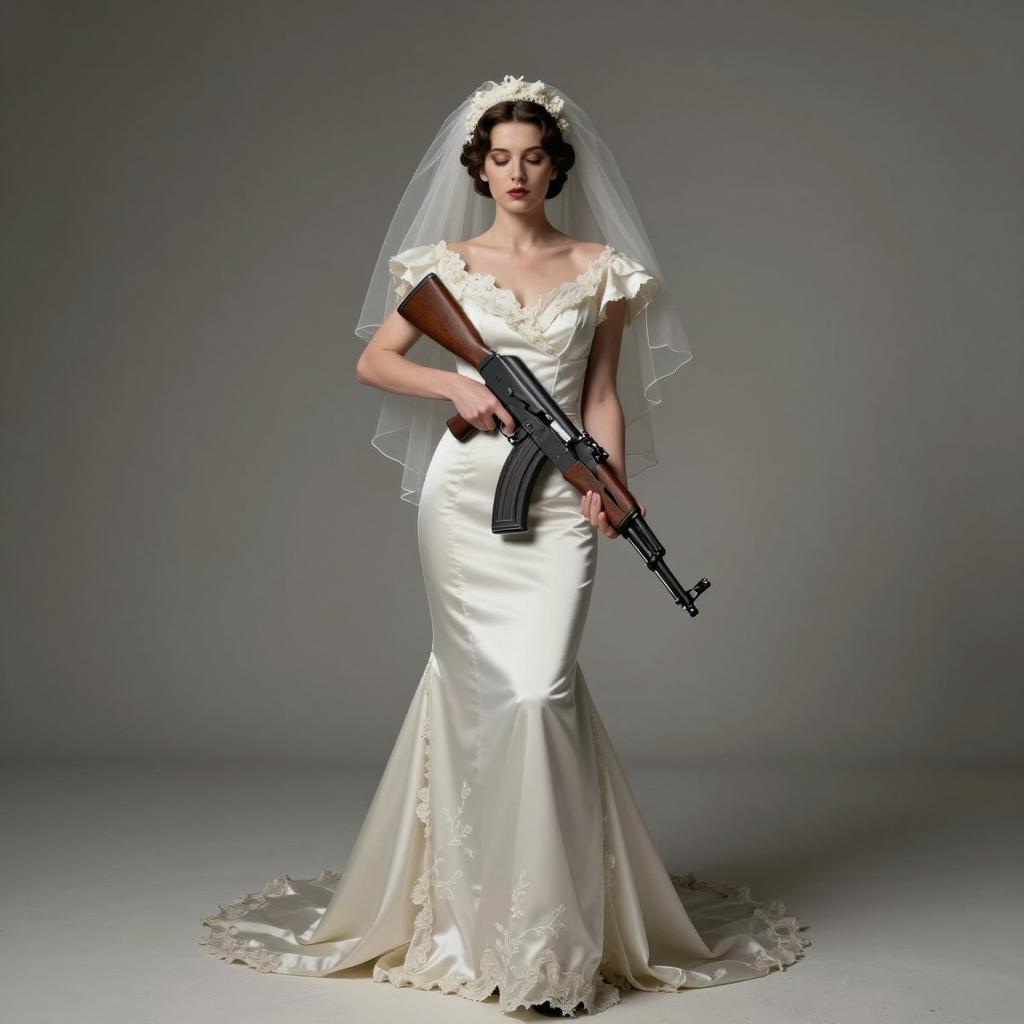 Bride in Wedding Dress Holding AK-47 Rifle