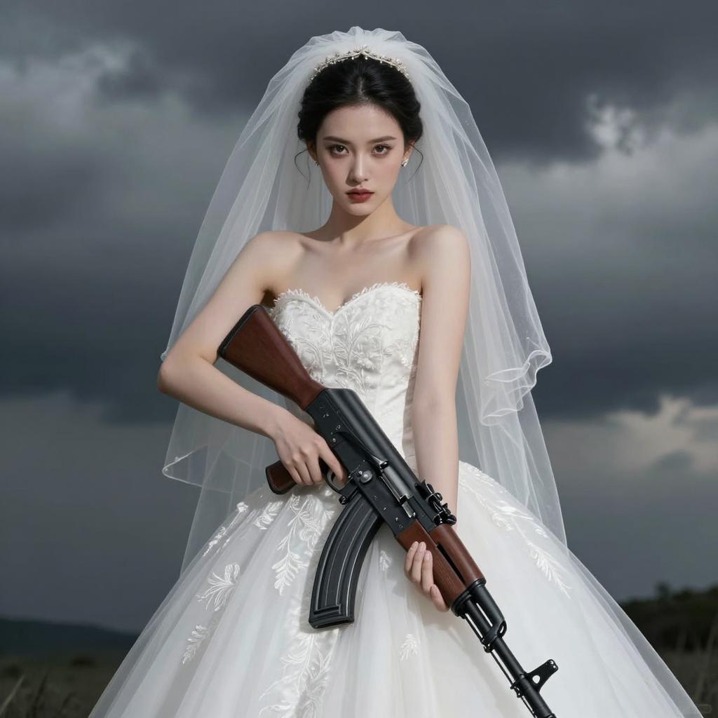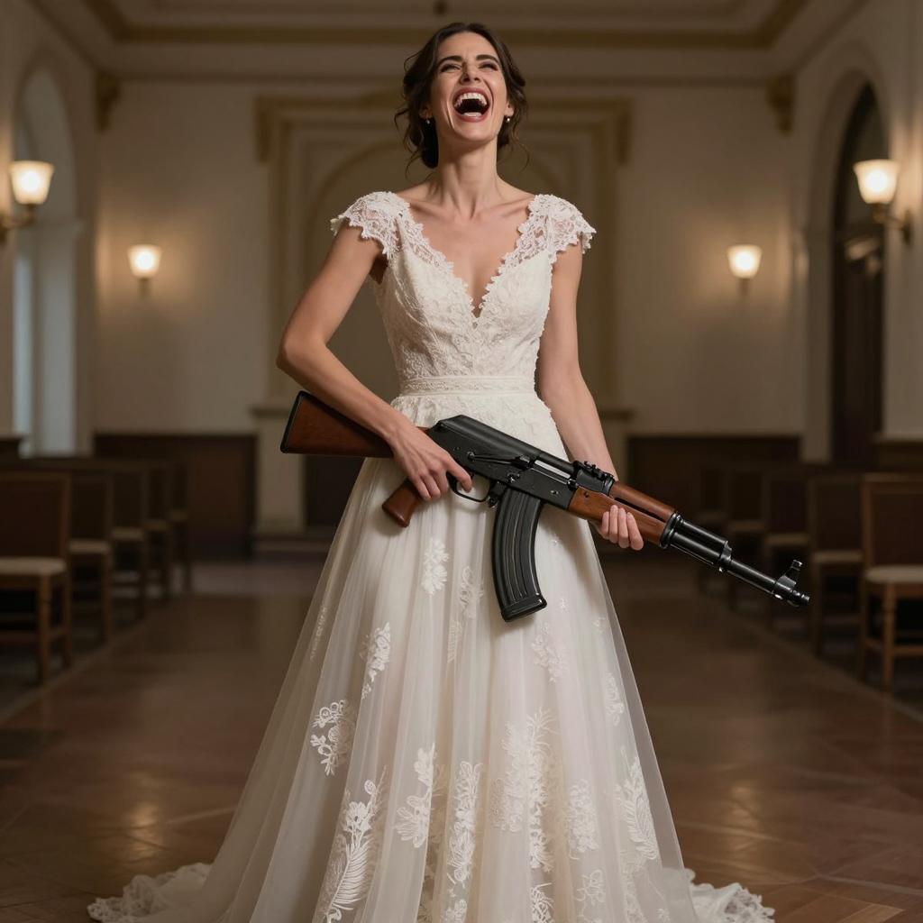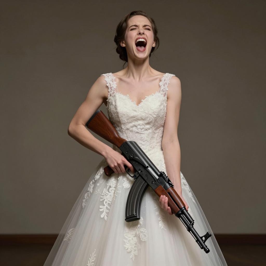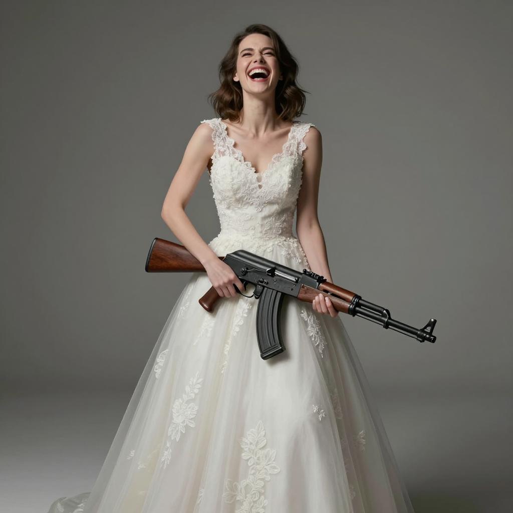 Bride in Wedding Dress Holding AK-47 Rifle