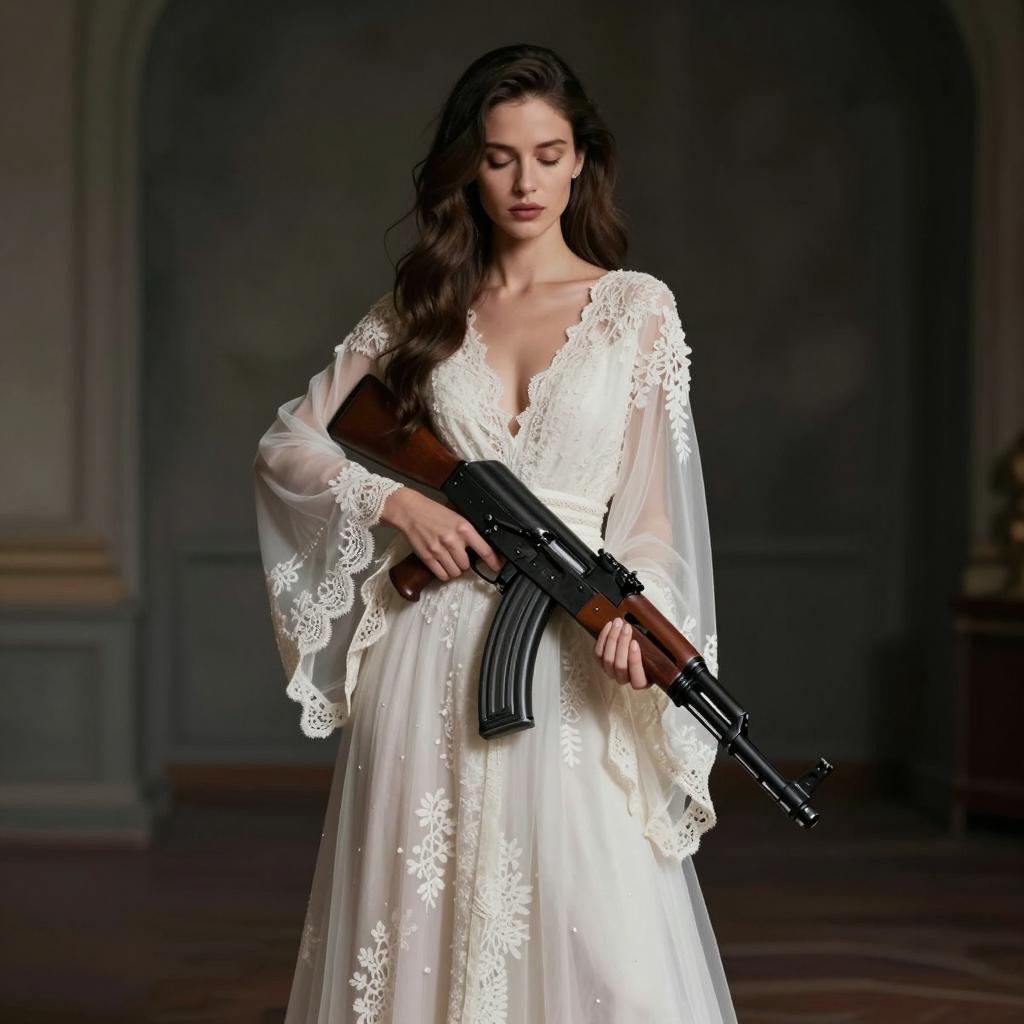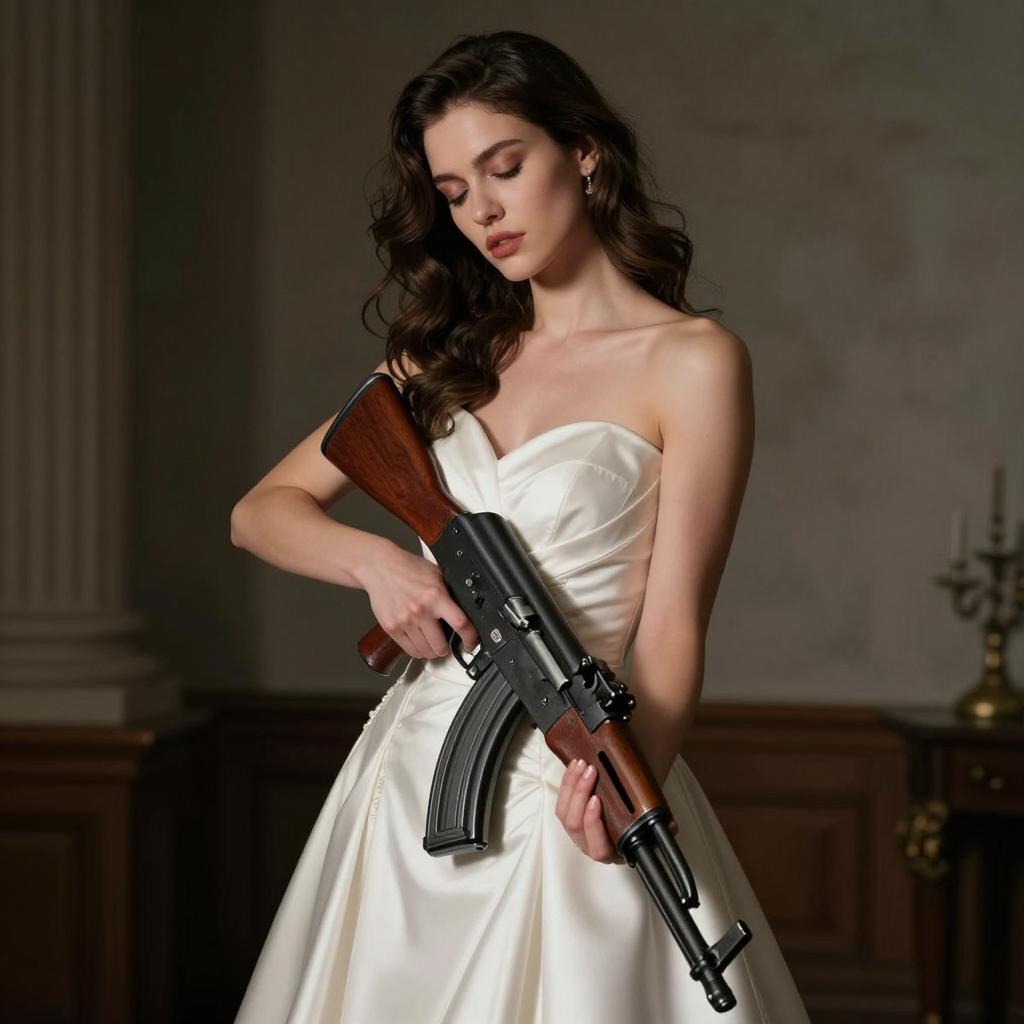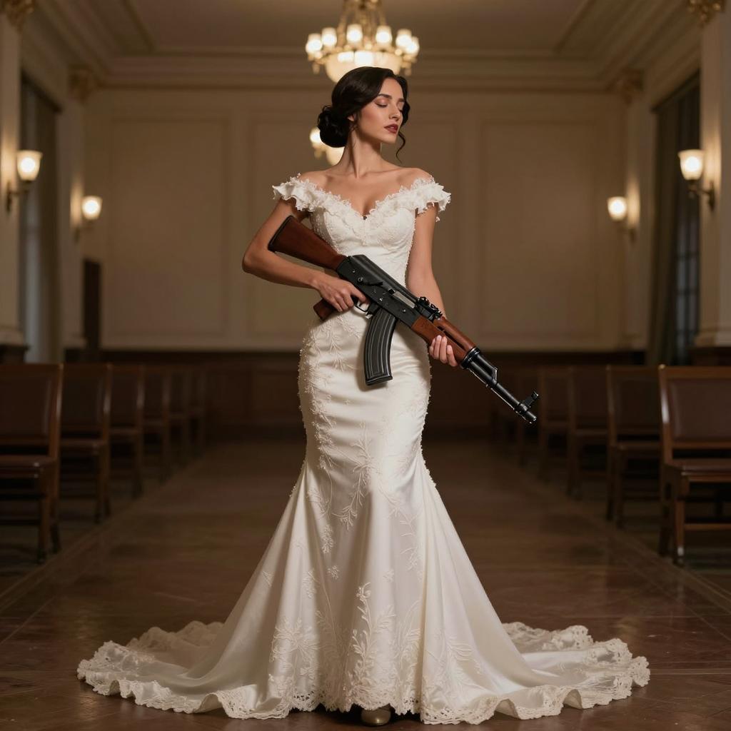 Woman with ak-47 gun wearing a wedding dress, dramatic non-violent portrait, fair-skinned woman with classic bridal makeup and bold eyes wearing strapless white wedding gown with subtle embroidery posed holding the rifle close to her body with eyes closed and dramatic posture in empty reception hall implied by soft out-of-focus lights, cinematic stylized photography, high resolution, ultra-detailed, no blood, no gore