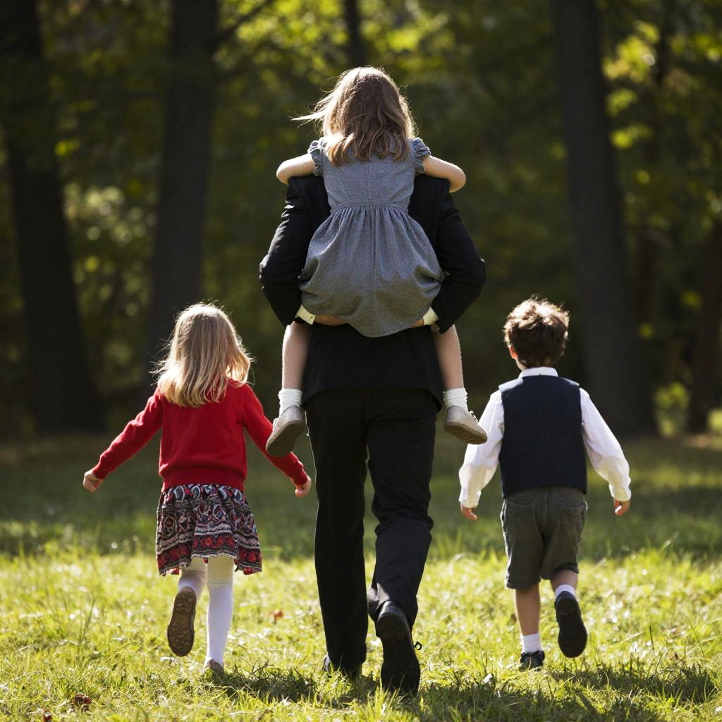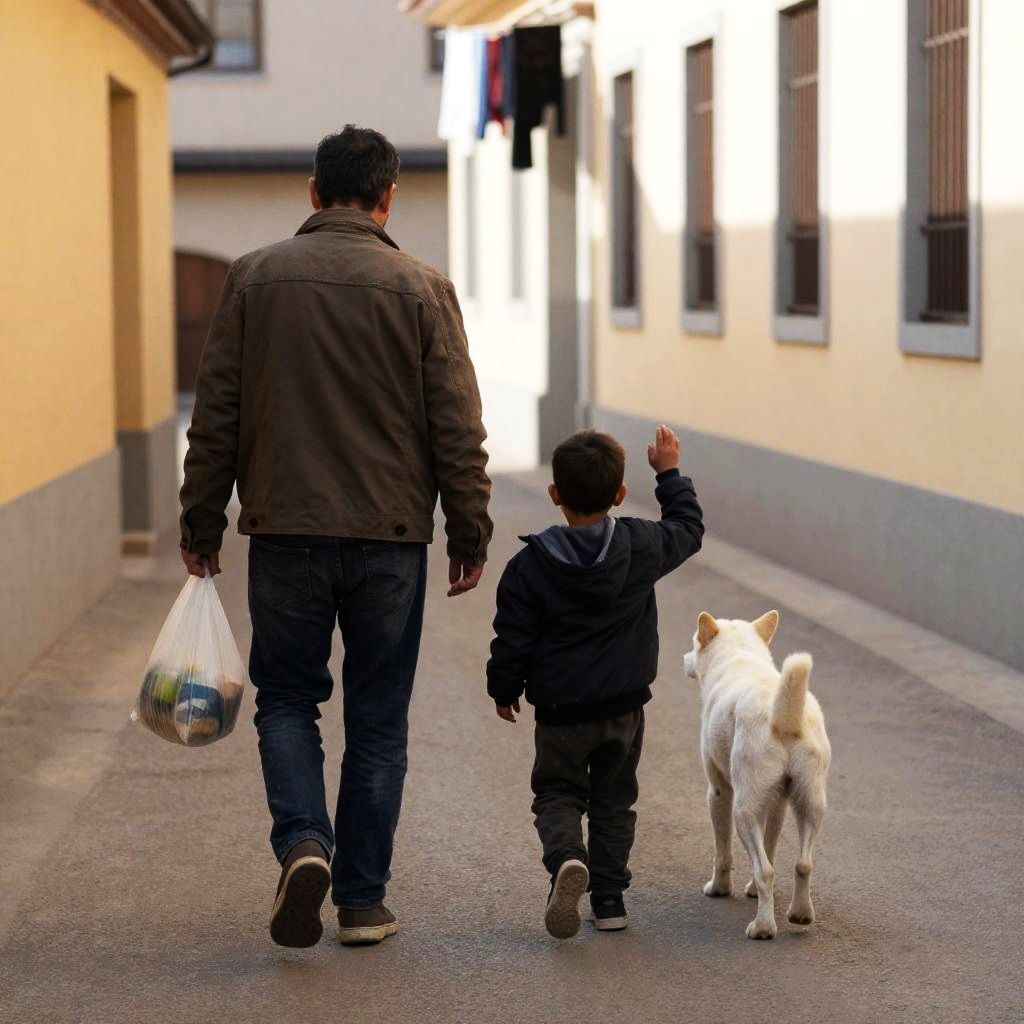 Photograph of a man and a child walking down a narrow, sunlit alley. Man in brown jacket and jeans, child in black jacket, pointing. White dog on right side. Narrow buildings with windows and doors on both sides. Bright light at end of alley. Man's back to camera, child's profile visible.