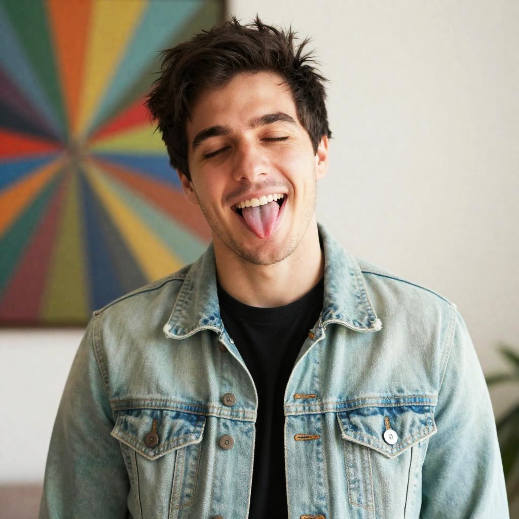 Portrait of a shirtless young man with pale skin, dark hair, and a beard, smiling broadly while holding his chin with his right hand. The man has an elongated face with subtle redness and shadows on the right side. The background is solid black.