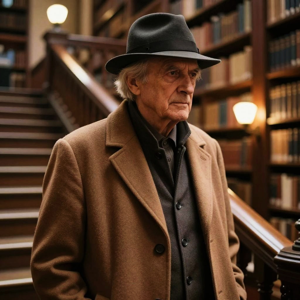 Soul Patch hairstyle on elderly gentleman, wearing classic wool coat and hat, in historic library stairwell, captured in fashion editorial style with warm spotlight.