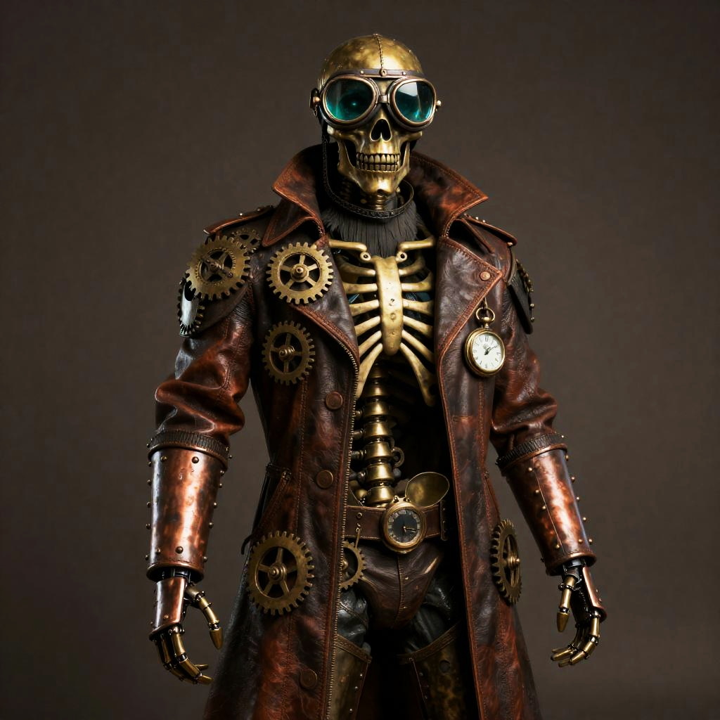Halloween outfit, worn by steampunk skeleton engineer, featuring brass gear-emblazoned leather coat with exposed clockwork ribs, riveted copper prosthetic arm, aviator goggles and a pocket watch, in aged brass and sepia with eerie teal glow accents.