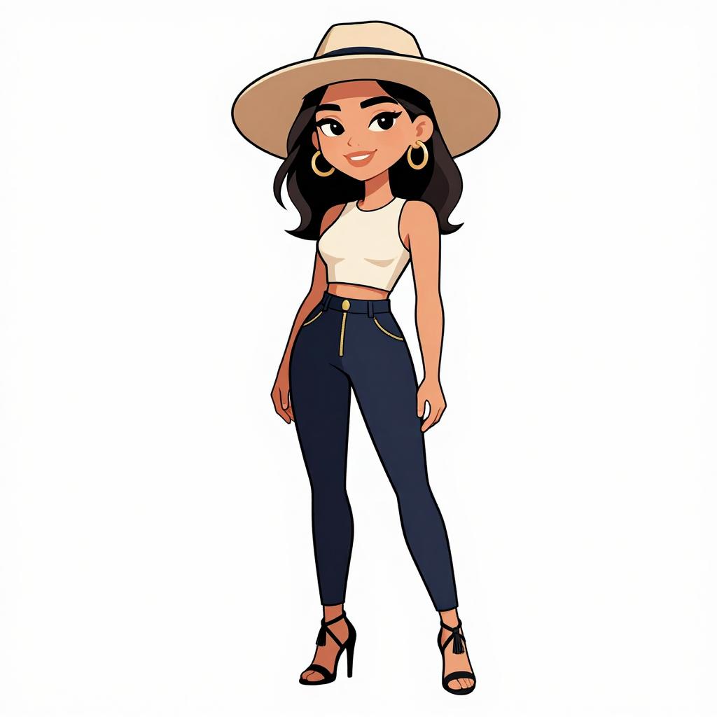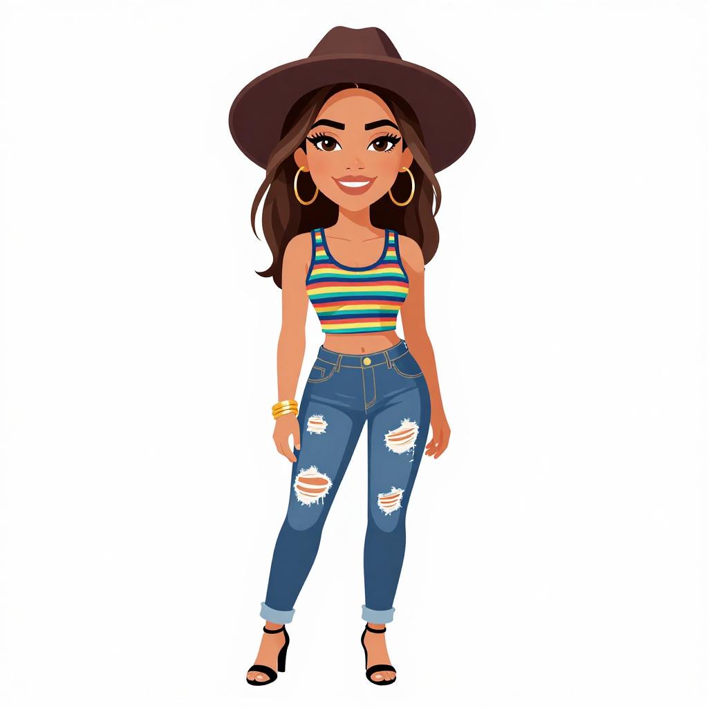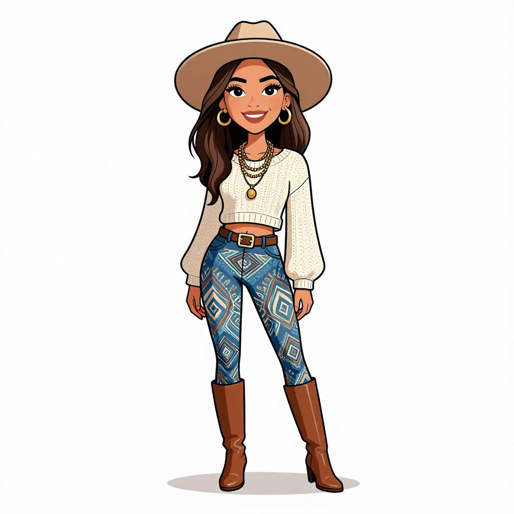 Woman with pretty face and pretty hair. smiling Woman, bohemian, white cropped knit sweater, long sleeve, patterned leggings in blue and white, calf-length brown leather boots, wide-brimmed tan hat, layered necklaces. --sref 1467