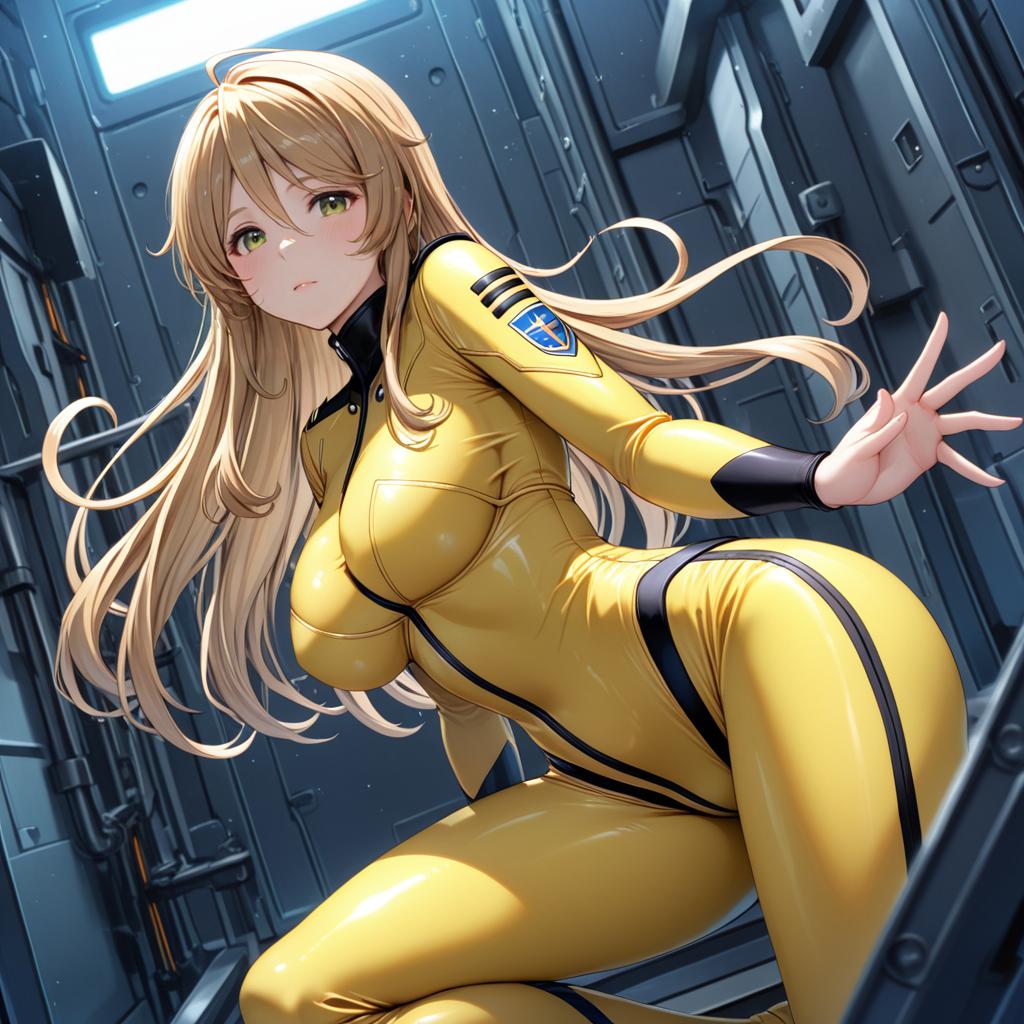 Detailed digital anime-style illustration of a young woman with long blonde hair and greenish-brown eyes wearing a tight, shiny yellow bodysuit with black accents. She is positioned in a futuristic, dark industrial sci-fi room with metallic walls and a small window. The character has medium to large breasts and an expressive, slightly contemplative facial expression. The scene evokes a space or sci-fi environment.