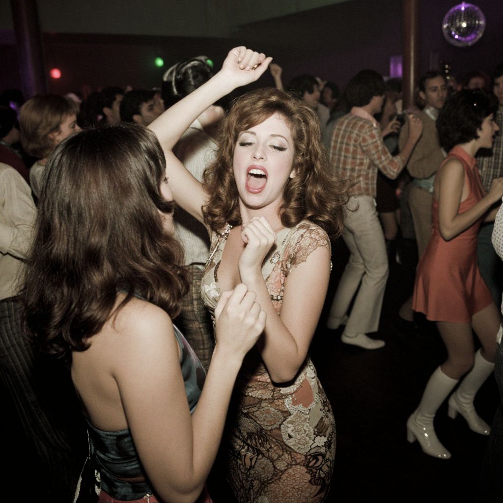 The image captures a vibrant scene from a vintage 1970s disco club, exuding a sense of volatile dancing energy. The photograph, taken with a Leica 50mm lens at ISO 400, showcases a sharp focus on the central figure, a woman with voluminous, wavy hair, wearing a detailed, lace-patterned dress. Her expression is one of intense emotion, possibly singing or shouting, as she dances with another woman in the foreground. The background is a blur of activity, with numerous people in various states of motion, their forms slightly obscured by the low lighting and the depth of field. The overall composition is dynamic, with the central figures drawing the viewer's eye amidst the chaotic, lively atmosphere of the club. The colors are muted yet rich, with a sepia tone that enhances the retro feel of the image.