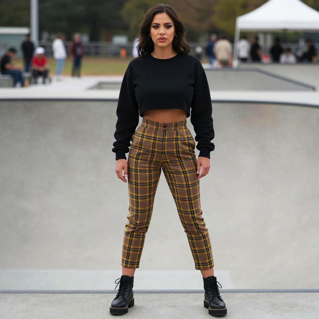 A petite woman in casual streetwear, wearing a cropped black sweatshirt and high-waisted plaid trousers in brown, yellow, and black, stands confidently at a skate park during a competition, embodying the visual style of Diego Fazio. Black lace-up ankle boots with a chunky sole complete her look. Sexy. Pretty face and beаutiful eyes. Big breasts