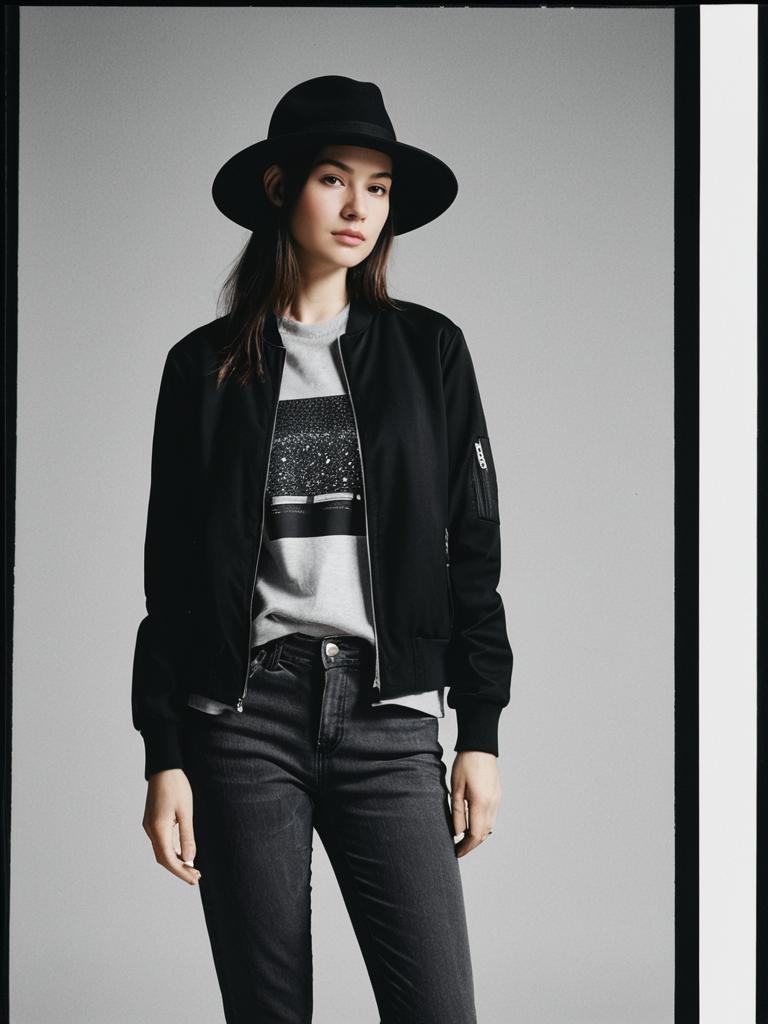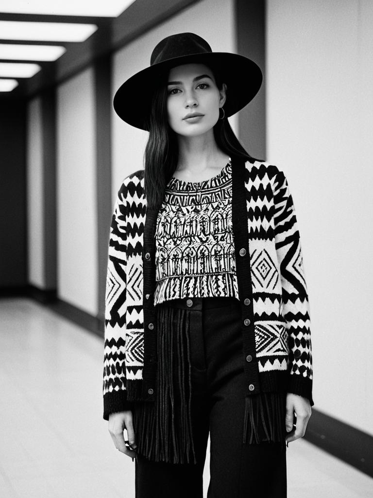 Woman, urban, light beige trench coat layered over a striped turtleneck sweater, high-waisted skinny jeans, wide-brimmed black felt hat.