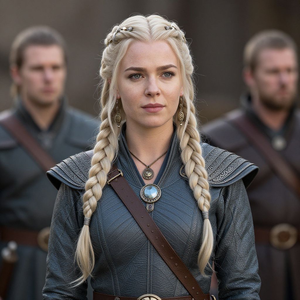 Photograph of a young blonde woman with fair skin, wearing a dark, textured medieval-style tunic with a brown leather strap across her chest. Her long hair is braided into two pigtails, and she has blue eyes and subtle makeup. She wears a pendant with a blue gemstone around her neck. In the blurred background, two men with similar dark attire and braided hair stand, creating a medieval army setting. The image has a realistic, cinematic quality, reminiscent of fantasy film visuals.