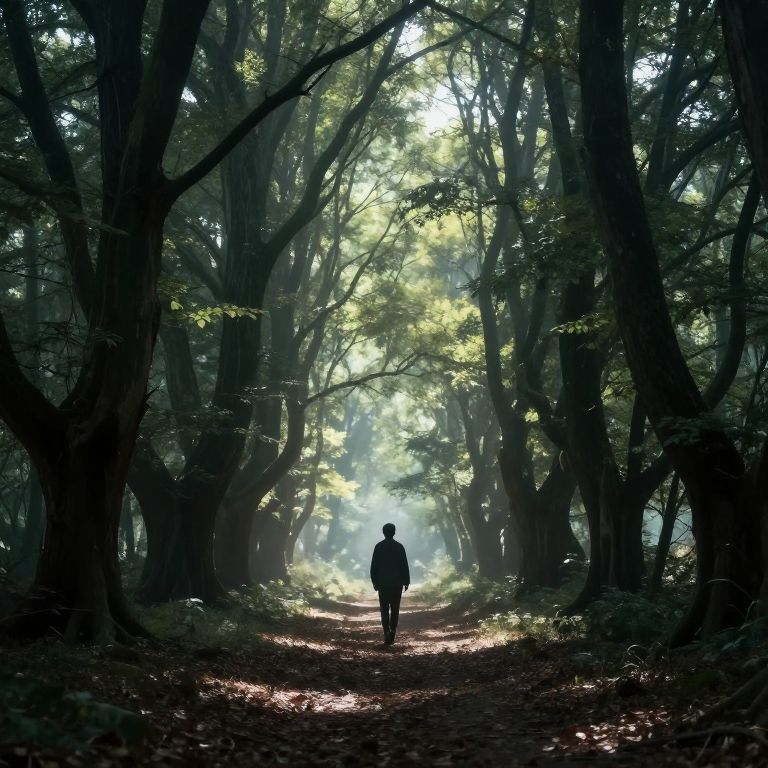 A solitary figure walks through a mystical forest bathed in ethereal light, where the trees stand as silent sentinels, their branches reaching out like living arms, weaving a tapestry of shadow and sunlight that whispers secrets unseen by the world beyond.