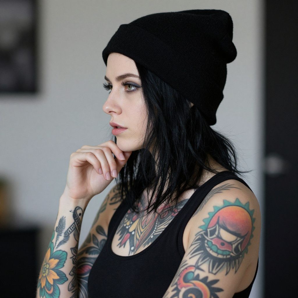 Photograph of a tattooed woman with pale skin and straight, shoulder-length black hair, wearing a black beanie and a black tank top. She's shown in profile, looking to the left, with her left hand raised to her chin. Her arms and neck are covered in colorful, intricate tattoos. The background is blurry, with a white wall and dark, indistinct objects.