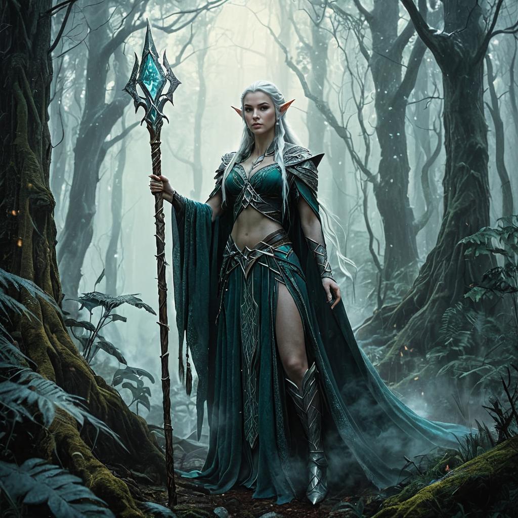 Elven Sorceress with Crystalline Staff in Mystical Forest