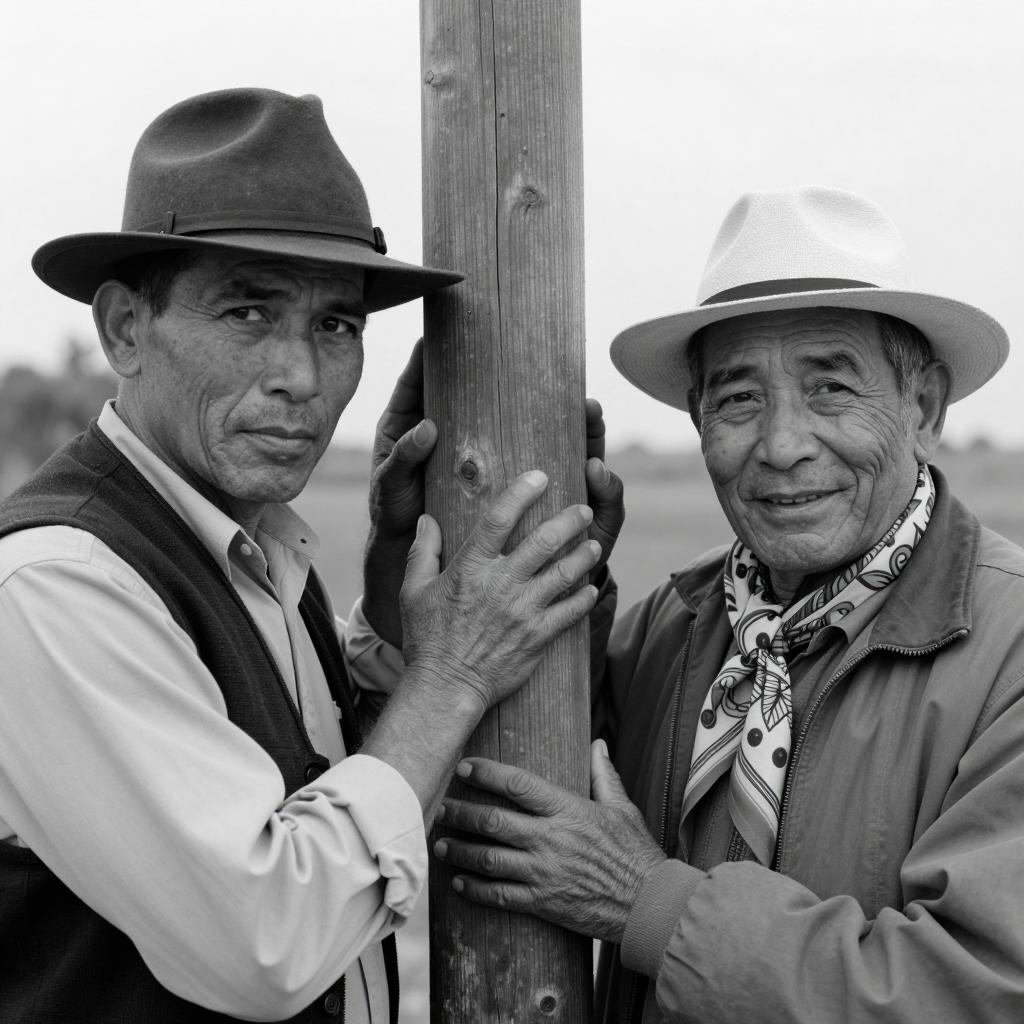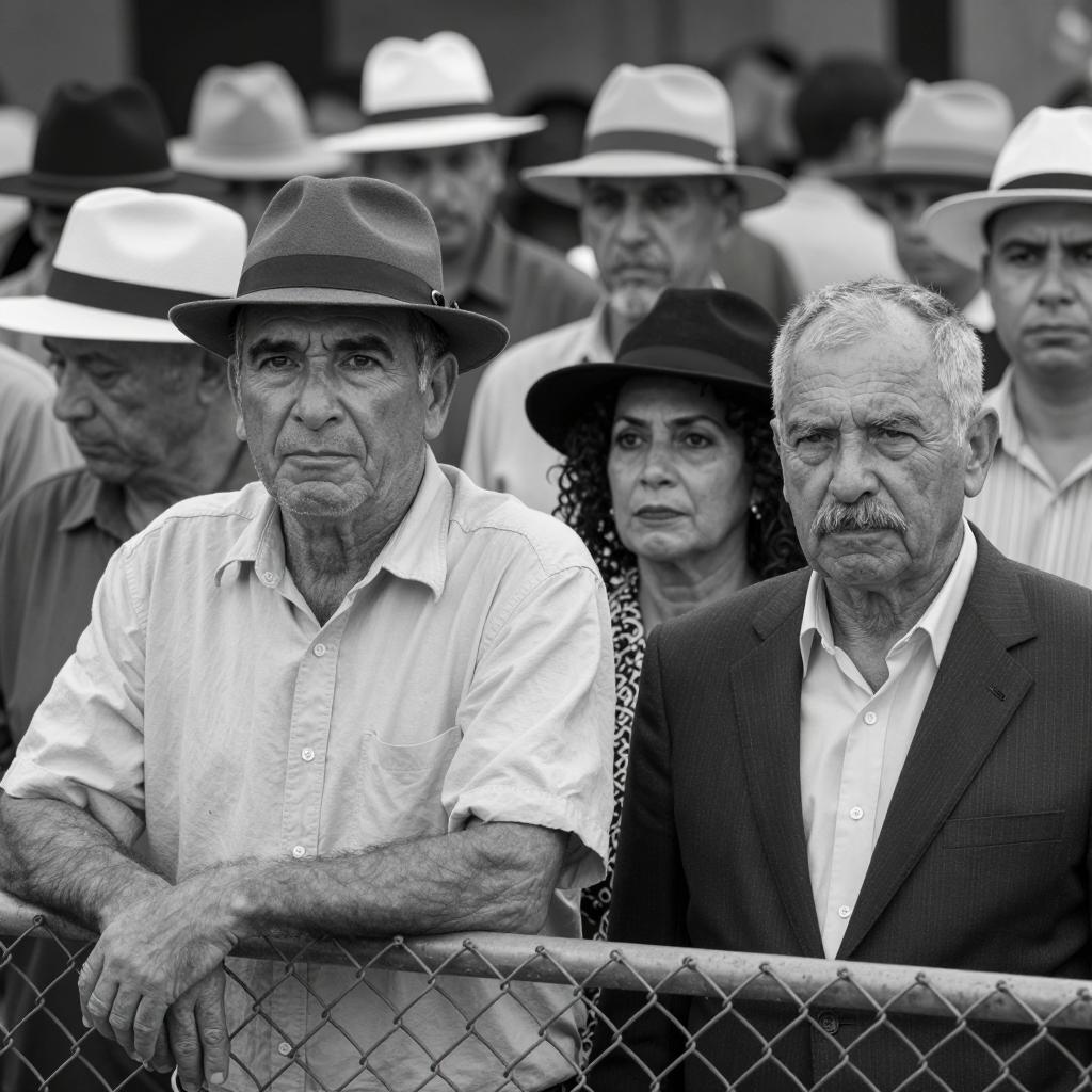 Black and white photograph of a diverse group of middle-aged and elderly people in serious expressions at an outdoor setting. Foreground features a man in a fedora hat and light shirt leaning on a chain-link fence, a woman with curly hair wearing a black hat and patterned clothing, and an older man with gray hair and mustache dressed in a suit. Background includes several men wearing various styles of hats, creating a dense crowd scene.