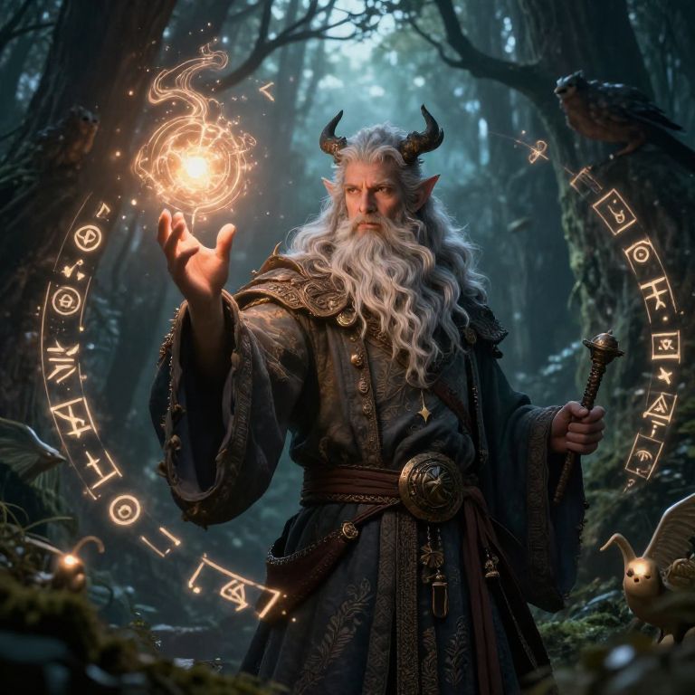 Digital artwork of a powerful, horned, white-bearded wizard with pointed ears standing in a dark, enchanted forest. He wears a detailed, dark brown robe with gold embroidery, belted at the waist. His right hand conjures a glowing, circular magical symbol, surrounded by runes in a glowing arc. He holds a staff in his left hand. The forest background is dense with tall, shadowy trees and a misty atmosphere. A small, luminescent creature hovers nearby. The image is highly detailed and fantastical, with a magical, otherworldly vibe.