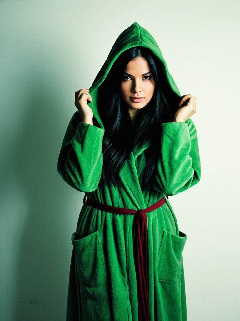 Green costume woman, solo, 1girl, robe, hood, standing, black hair, long hair, looking at viewer, hood up, arms at sides