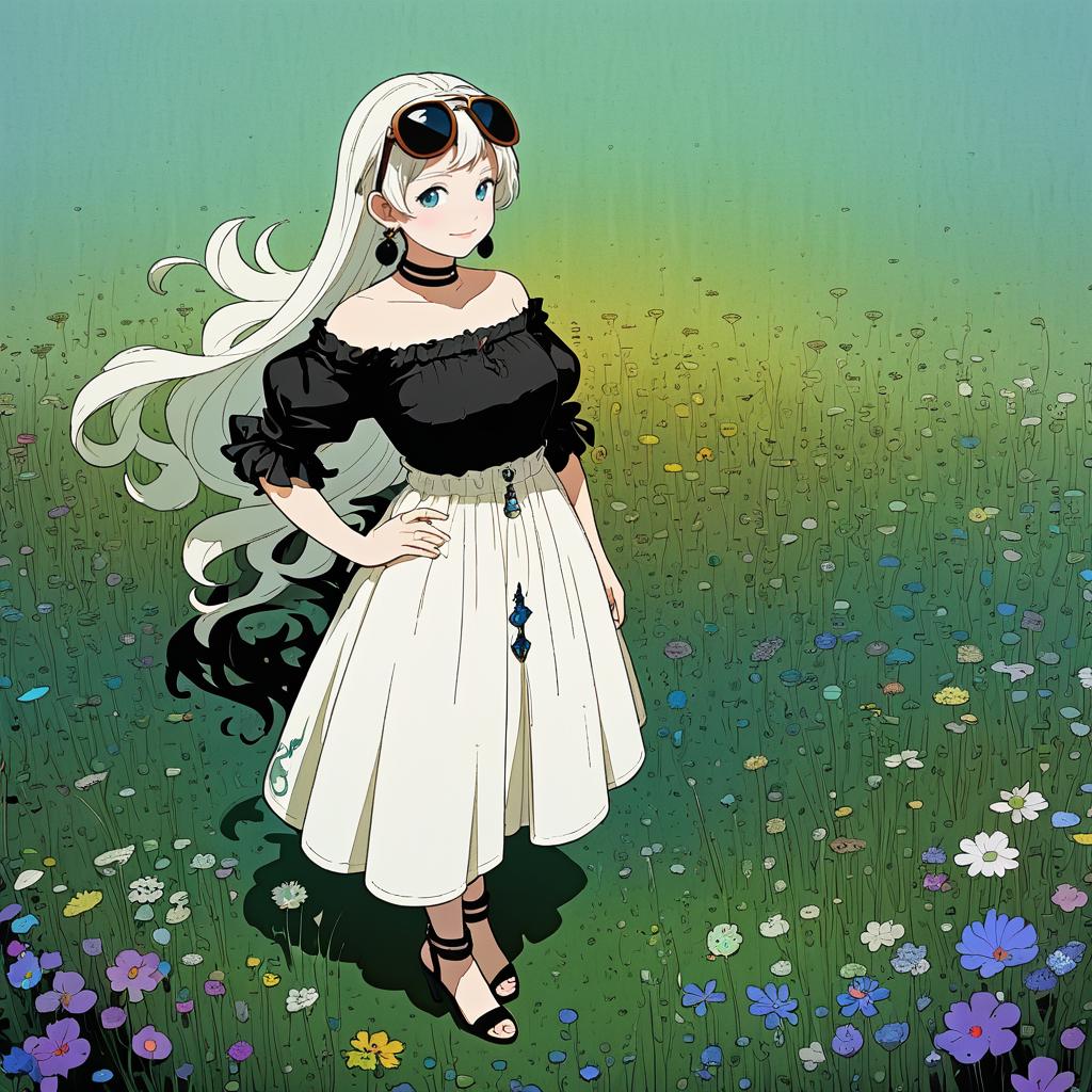 1girl, Bravely Default II, standing, full body, looking at viewer, smile, eyewear on head, black choker, hand on own hip, off-shoulder top, dangling earrings, ankle strap heels, serene meadow, cel shading, serene