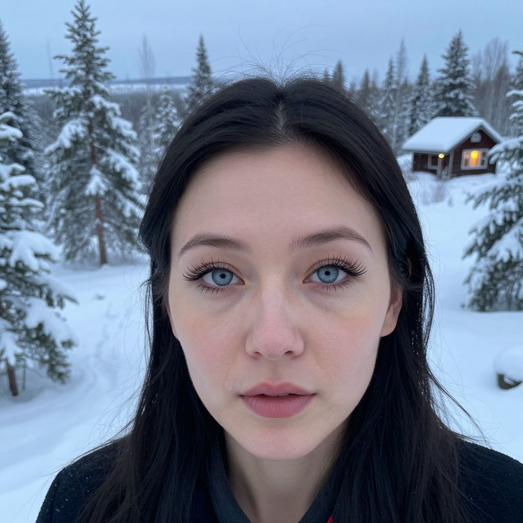 Envision an enigmatic portrait of a Native American woman with captivating icy blue eyes accentuated by long dark lashes, delicate high cheekbones, full lips, and radiant porcelain skin adorned with subtle age lines. Capture this image using an iPhone from a unique bird's-eye view perspective. Set against a serene Scandinavian winter landscape featuring snow-covered pine trees and the distant twinkle of a solitary cabin's lights, her captivating gaze is the focal point. The soft, blurred backdrop evokes tranquility and introspection, harmoniously blending nature's ethereal beauty with human grace.