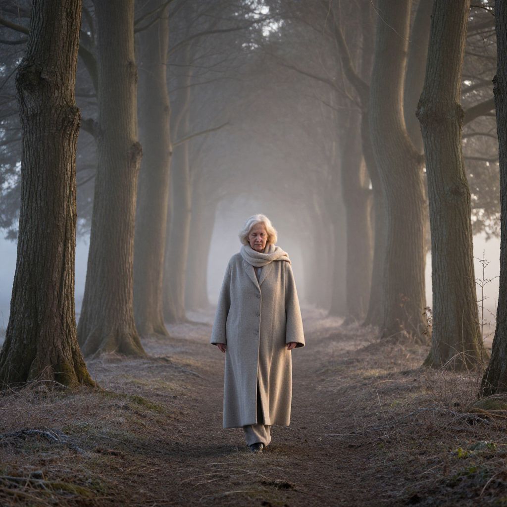Mystical Dawn Walk of Elderly Woman