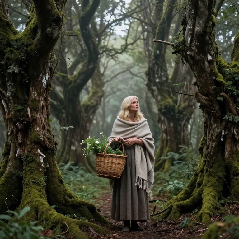 Old blonde woman walking through a misty forest path at dawn, her aged face radiant with a quiet strength, wearing a long flowing coat and scarf, subtle hints of frost and golden morning light filtering through tall ancient trees, mystical and peaceful scene.