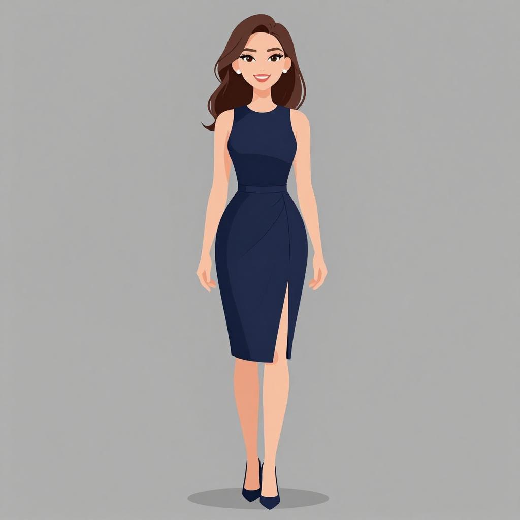 Illustration of a smiling woman with long brown hair wearing a solid navy blue cocktail dress featuring a high neckline, sleeveless design, fitted waist, asymmetrical hemline with a front slit, and knee-length skirt. She is accessorized with simple navy stiletto heels and minimal jewelry, including stud earrings, against a plain gray background.