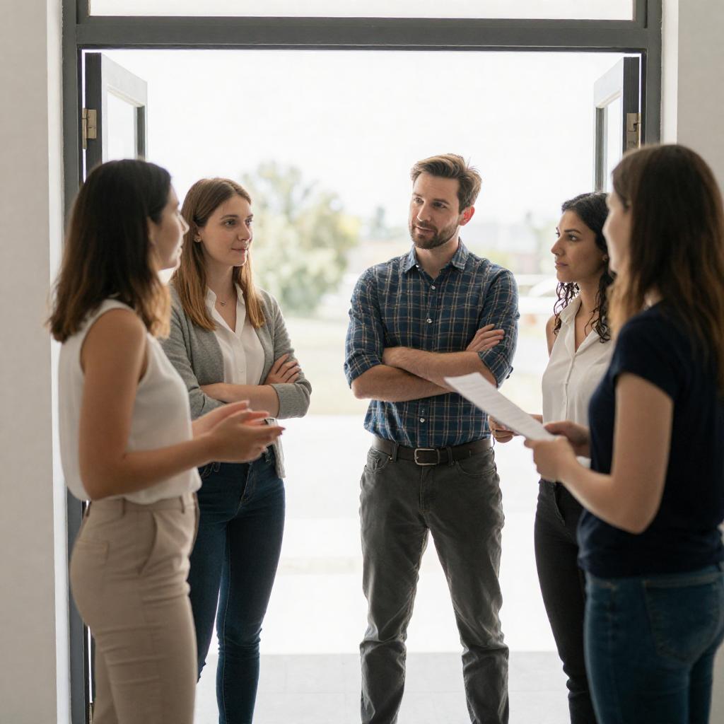 Photograph of six people at a restaurant table. Central male with dark hair, beard, purple shirt, and black jacket smiles. Left female with blonde hair and black top gestures. Right female with blonde hair and denim jacket looks at central male. Three plates with food and two glasses with drinks on blue tablecloth. Background includes wooden walls and other seated patrons.