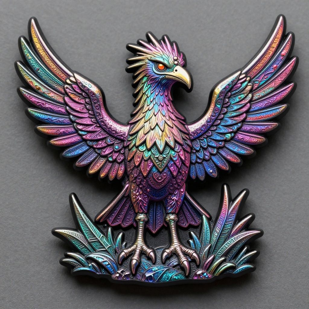 Vibrant, metallic, multicolored phoenix with outstretched wings and detailed feathers, standing on grass, digital art with a textured, dark