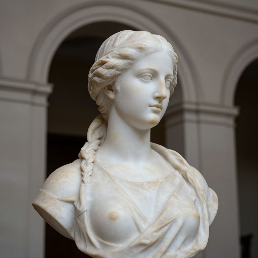 Photograph of a classical white marble bust of a young woman with delicate features and a serene expression. Her hair is intricately detailed, styled in a loose braid that drapes over her right shoulder. She wears a draped garment that exposes her right breast. The background features an arched, stone building with soft shadows, adding depth to the image. The marble's smooth texture contrasts with the soft, flowing lines of her hair and garment. The lighting highlights the bust's detailed craftsmanship, emphasizing the lifelike quality of the sculpture.