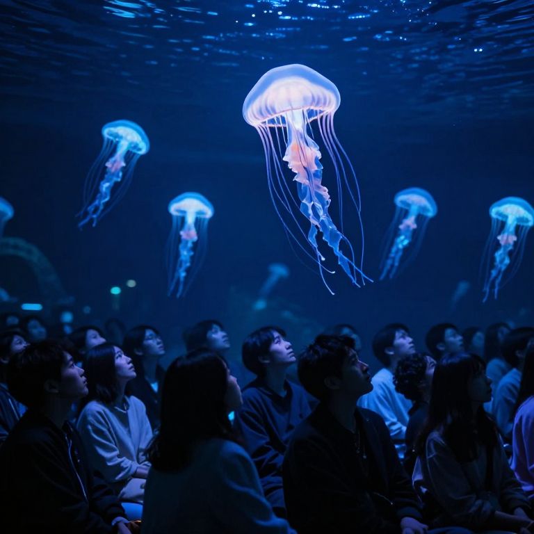 Glowing jellyfish-shaped train cars float serenely above a dense forest canopy, their translucent domes emitting a warm, pulsating light that mirrors the rhythmic movements of the passengers seated within vibrant orange benches.