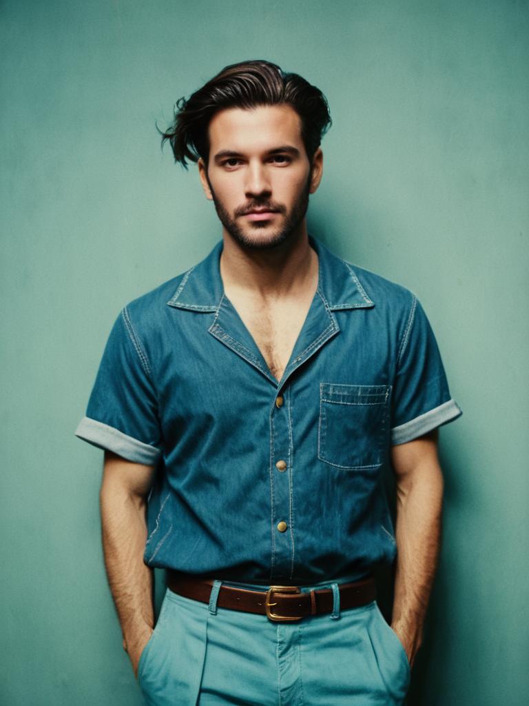 Portrait of a young man with dark hair and light skin, dressed in a casual summer outfit consisting of a light denim shirt with rolled-up sleeves tucked into teal pants, accessorized with a brown leather belt. The image features a teal textured background enhancing the stylish and relaxed vibe.