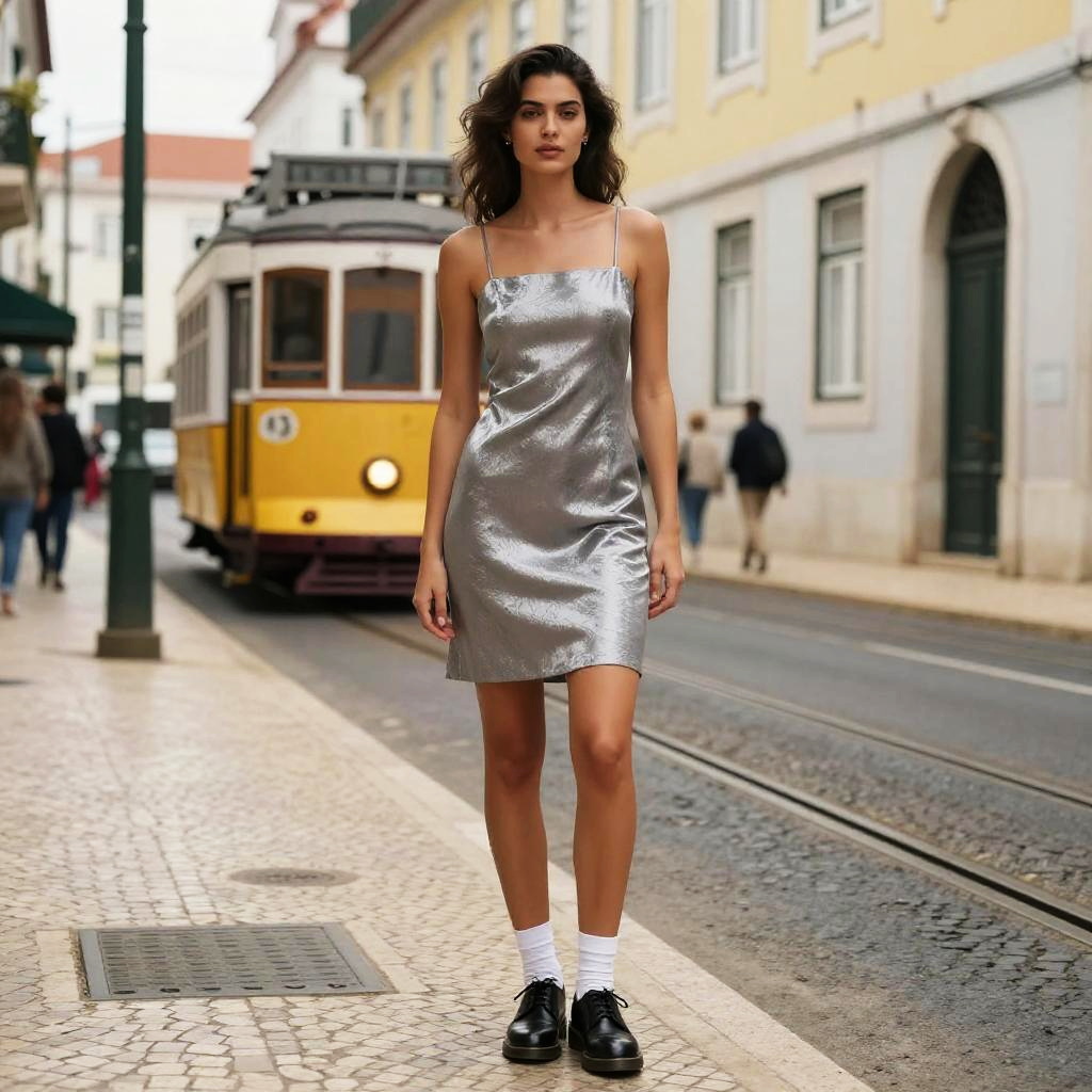 A Voluptuous woman in a minimalist, metallic-threaded silver and gray slip dress with a square neckline and spaghetti straps, standing in a Historic street in Lisbon with tram lines, surrounded by the charm of old architecture, wearing white crew socks and black leather derby shoes, in the visual style of JC Staff. Sexy. Pretty face and beutiful eyes