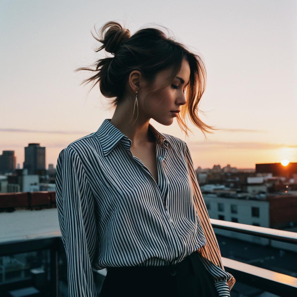 Lowlights hairstyle on woman, wearing casual leather jacket, in urban street, captured in fashion editorial style with golden hour warmth.