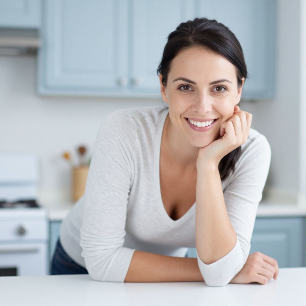 Photograph of a smiling, dark-haired woman with fair skin, wearing a white long-sleeve top, leaning on a kitchen counter in a bright