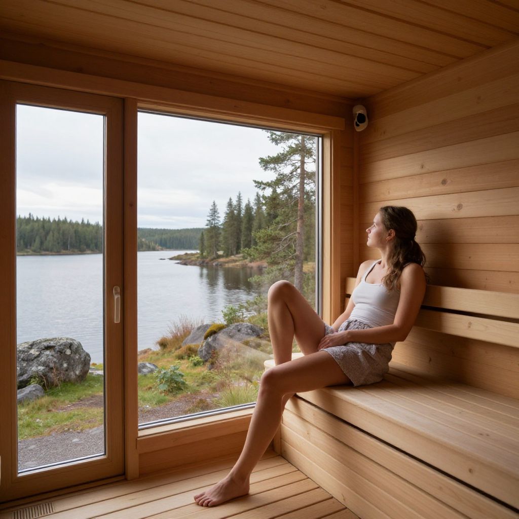 Woman relaxing in a cozy wooden sauna at Johanna Lehtinen's idyllic Finnish summer cabin, overlooking a serene lake and forested archipelago landscape through a large window.