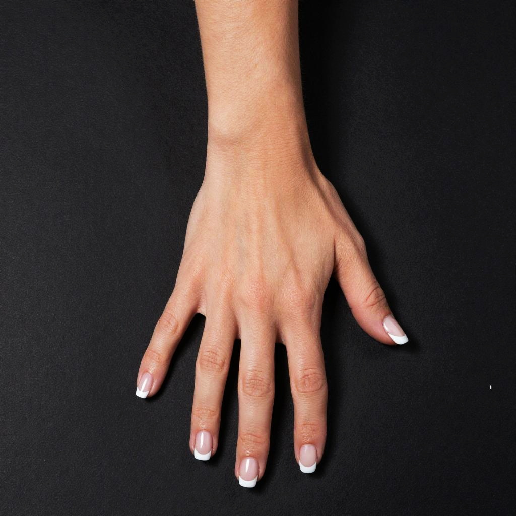Photograph of a light-skinned female hand with white French-manicured nails, palm down, fingers spread, against a black textured background.