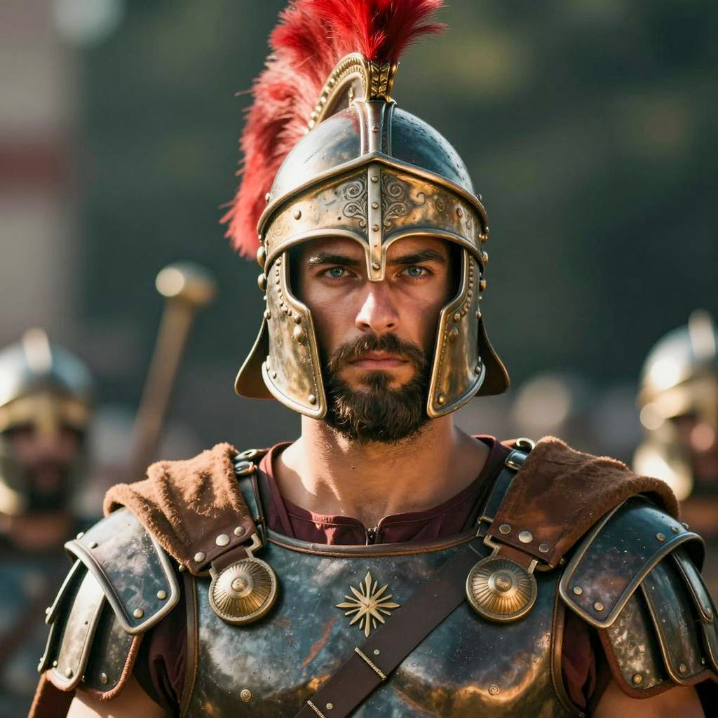 Authentic roman soldier, photorealistic portrait of a muscular male gladiator, dark skin, brown beard, intense blue eyes, wearing ornate bronze helmet with red plume, detailed armor, brown leather cloak, background slightly blurred greenery, warm sunlight, epic fantasy style, cinematic quality, close-up, focused on face, soft shadows, natural light, realistic ures
