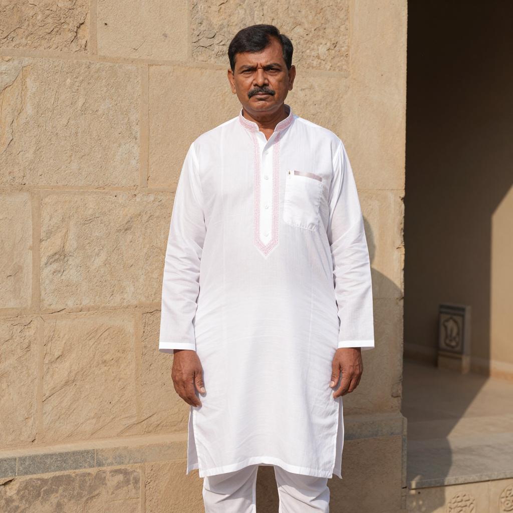 Kurta style shirt costume, photograph of an older Indian man standing against a rough, sandy beige stone wall, wearing a long white traditional kurta with pink embroidery near the chest, light gray pants, short black hair and mustache, serious expression, daytime, sunlight casting shadows, background includes a small, carved stone detail on the ground to the right, realistic style, medium shot, no additional objects, natural light, urban setting.