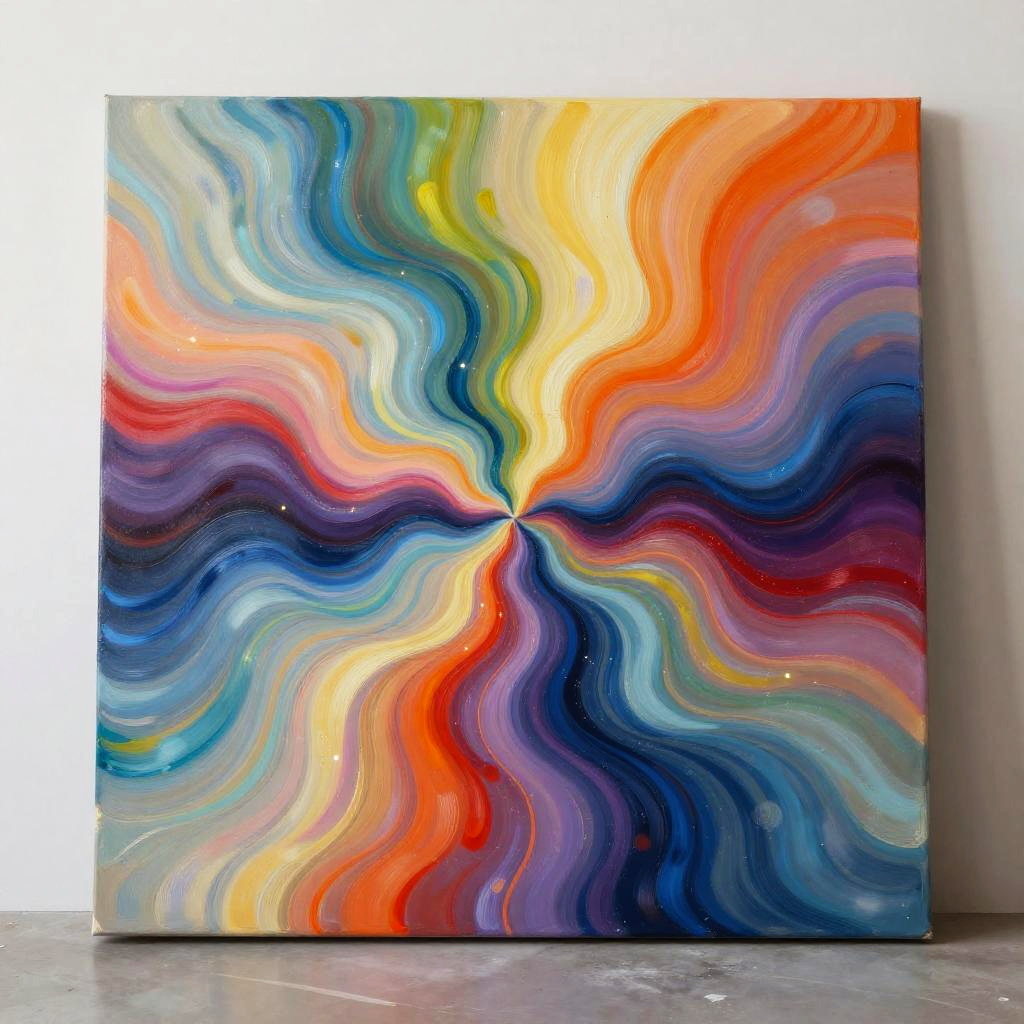 Photograph of a vibrant, abstract painting with wavy, fluid lines in bold colors. The painting features swirling patterns in red, orange, yellow, green, blue, purple, and black, creating a mesmerizing, hypnotic effect. The colors blend seamlessly with soft gradients and reflective highlights. The canvas is square and leans against a plain white wall, positioned on a gray, slightly reflective concrete floor. The overall style is modern and abstract, with a dynamic, energetic feel. The painting's texture appears smooth, with glossy, almost wet-looking paint.