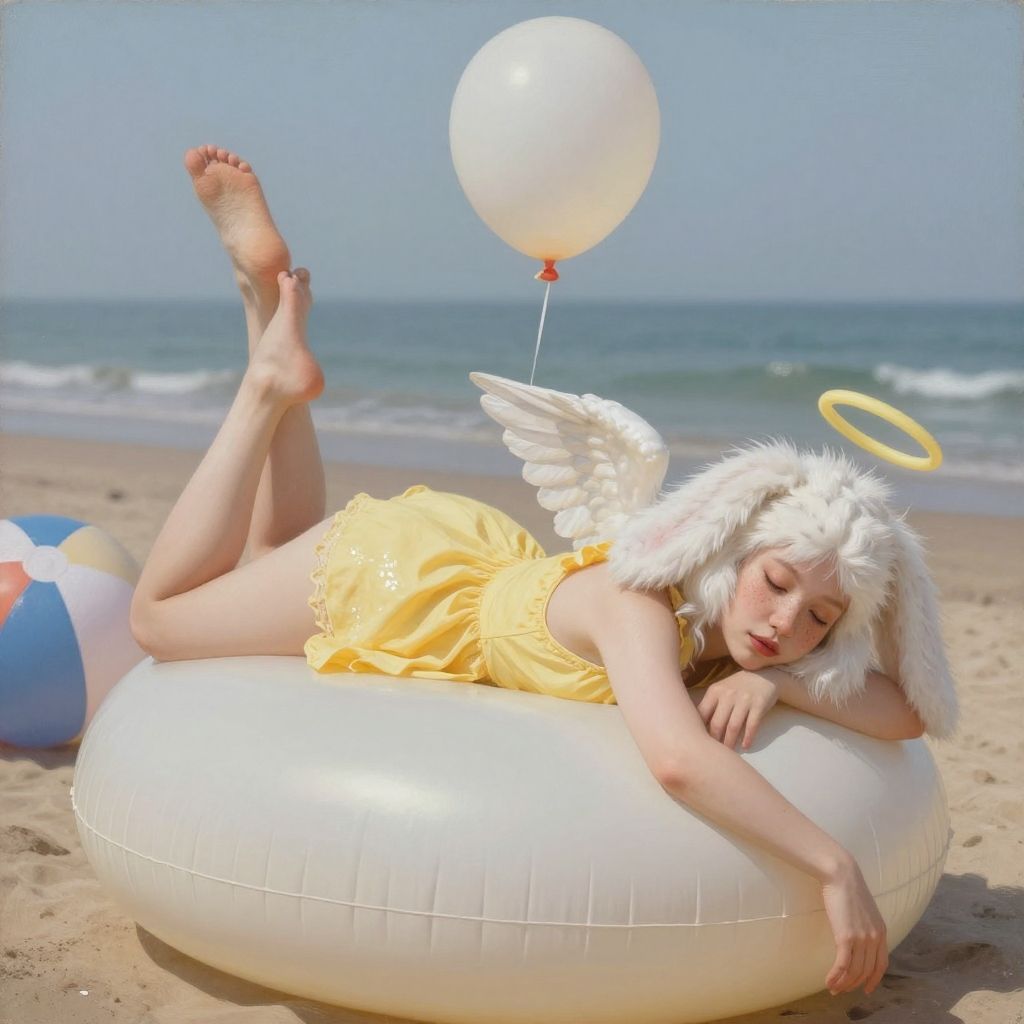 Score_9, score_8_up, score_7_up, score_6_up, score_5_up, score_4_up, female, bunny, rabbit, angel gabby, smile, angel, wings, halo, white fur, yellow dress, freckles, feral, semi-anthro, lidded eyes, seductive, naughty face, from side, from below, lying down, lying forward, on front, intimate, on balloon, against balloon, straddling, raised leg, paw, bottom of paw, bottomless, featureless crotch, dynamic view, big balloon, detailed balloon, realistic balloon, balloon knot, trying to pop a balloon, looner, balloon, sitpop, balloon fetish, straddling a balloon, squishy balloon, soft balloon, squish, bouncing, stretchy, red nose tilted head, drowsy, dreamy, hazy, glowing, foreshortening, detailed background outdoors, beach, modest swimwear, pooltoy, inflatable, beach ball, questionable, rating questionable, public, detailed, painting, realistic, solo, cute, open mouth, looking at viewer, glittery clothes, calming, relaxing, close up, extreme foreshortening, (foreshortening:1.2)