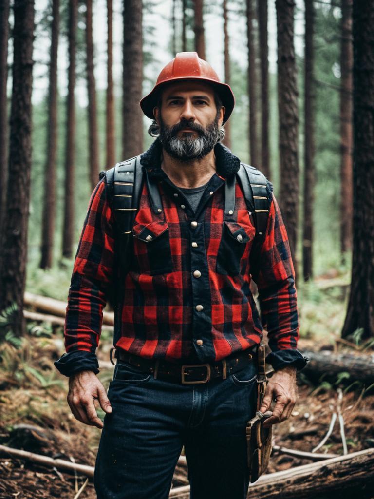 Portrait of a rugged man wearing a red and black checkered lumberjack shirt with a dark denim vest, standing in a forest. The man has dark hair and a full beard, with a serious expression. The background shows tall pine trees, creating a woodland atmosphere.