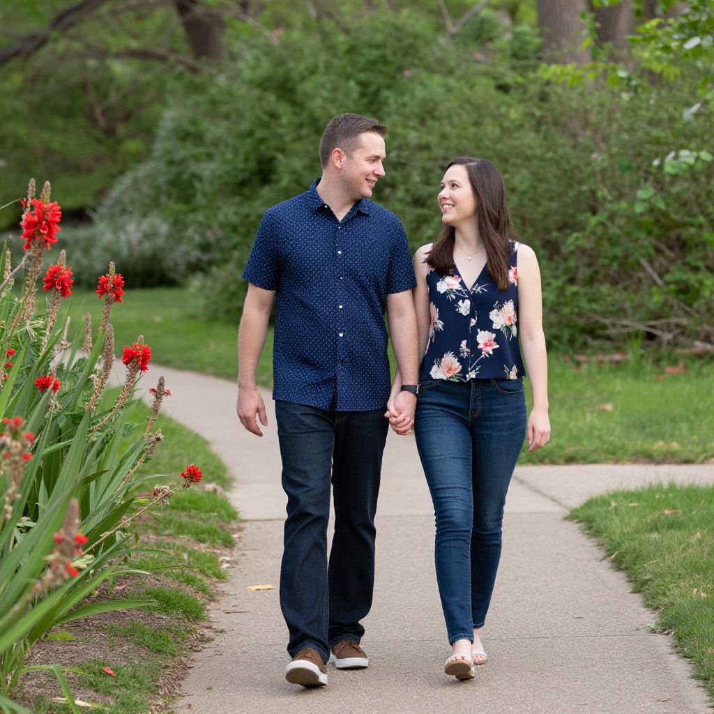 Photograph of a smiling couple holding hands on a park path, the man in a navy polka dot shirt, the woman in a floral top and
