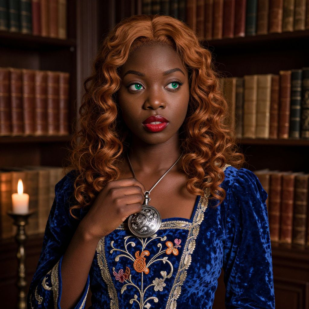 Craft an ultrarealistic portrait of a young African woman with compassionate green eyes, cascading curls of auburn hair, and full red lips. Adorned in a regal royal blue velvet dress with intricate hand embroidery, she exudes an air of enigma as her gaze rests off to the side, a blend of curiosity and determination. Her fingers delicately caress a hardy silver locket nestled against her chest. The scene unfolds within a dimly lit candlelit library, ancient leather-bound books lining the walls, casting warm shadows across her face, creating an atmosphere of mystery and intellect. Subtle window light highlights her skin's texture, adding depth to the portrait, accentuating her captivating presence.