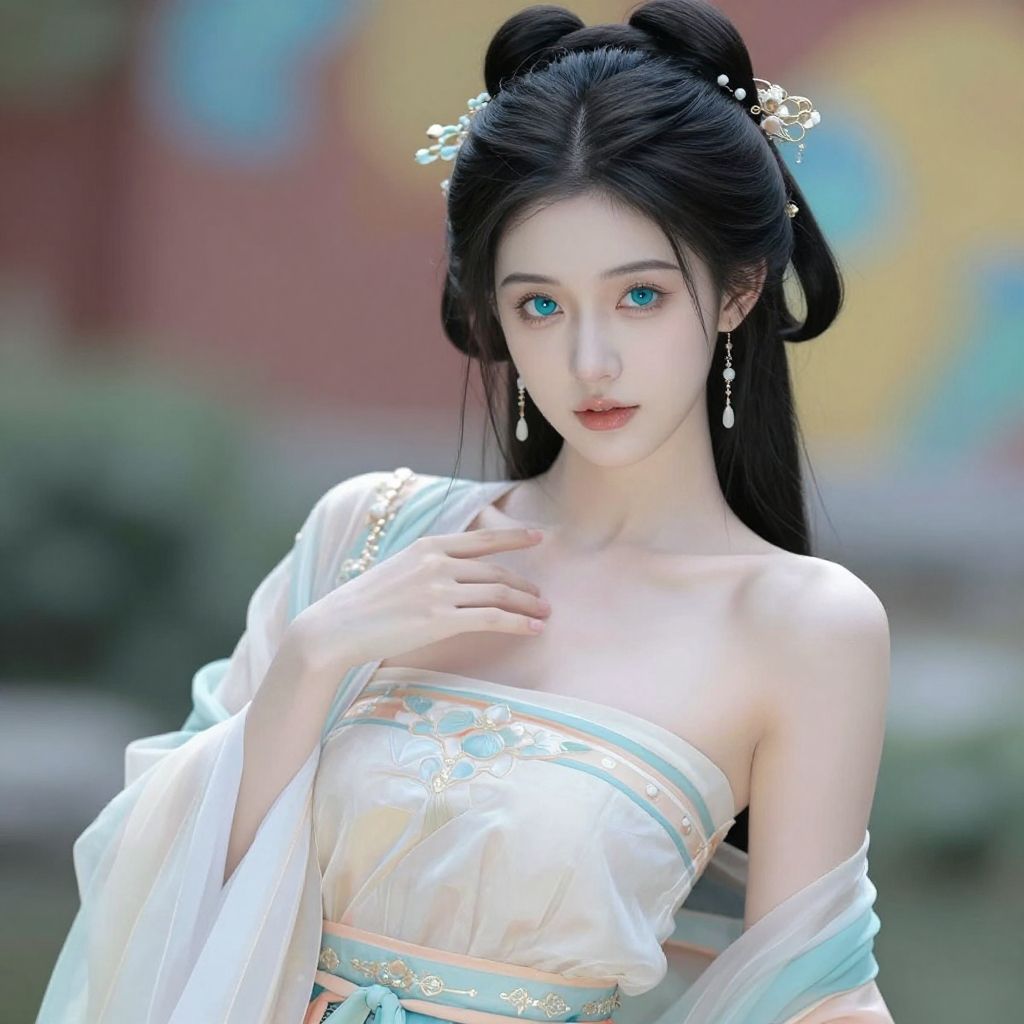Masterpiece, best quality, 1girl, aqua eyes, black hair, closed mouth, earrings, multicolored background, jewelry, looking at viewer, double bun, outdoors, solo, upper body, ((perfect female figure)) narrow waist, chinese deity, seductive posture, sexy pose, alluring, clean, beautiful face, pure face, pale skin, ((hanfu, chinese clothes))