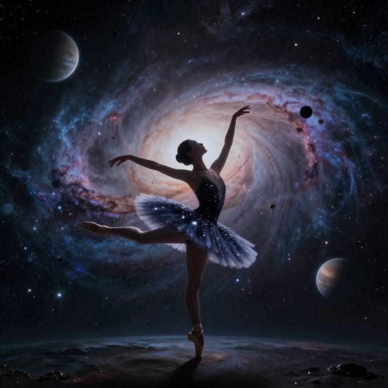 A digital artwork portraying an ethereal dancer pirouetting in a cosmic ballet, her tutu adorned with stardust against the backdrop of swirling galaxies and nebulae. From a first-person view, witness her graceful movements influenced by distant planets and black holes, evoking both awe and wonder at her resilience amidst the indifferent cosmos. This scene captures the melancholic beauty of existence in contrast to an unfathomably vast universe, blending the ethereal grace of dance with the raw power of celestial bodies.